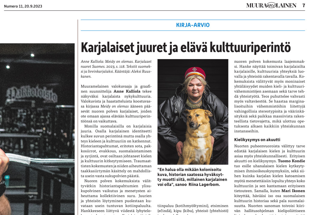 Muuramelainen valokuvaaja ja graafinen suunnittelija Anne Kalliola tekee näkyväksi karjalaista nykykulttuuria. Valokuvista ja haastatteluista koostuvassa kirjassa Meidy on olemas ääneen pääsevät nuoren polven karjalaiset, joiden ote omaan ajassa elävään kulttuuriperintöönsä on vaikuttava.
